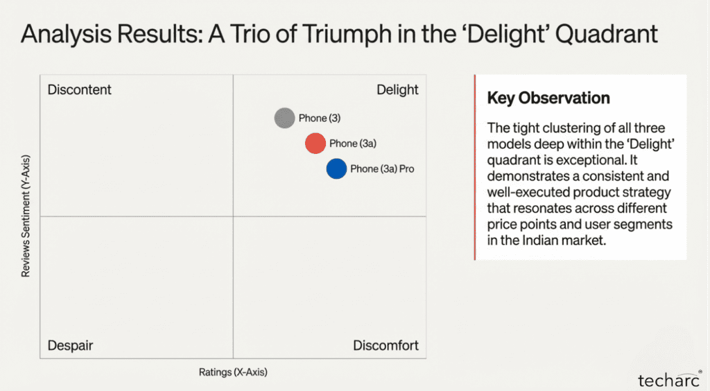Techarc’s RaRe framework maps average user ratings on the X-axis and review sentiment, derived through NLP, on the Y-axis to decode the “what” and “why” of customer voice. In this mapping, all three Nothing phones cluster tightly in the top-right Delight quadrant, a zone reserved for products that exceed expectations and create brand advocates. This tight grouping across price points signals a consistent and well-executed product strategy rather than isolated model success.