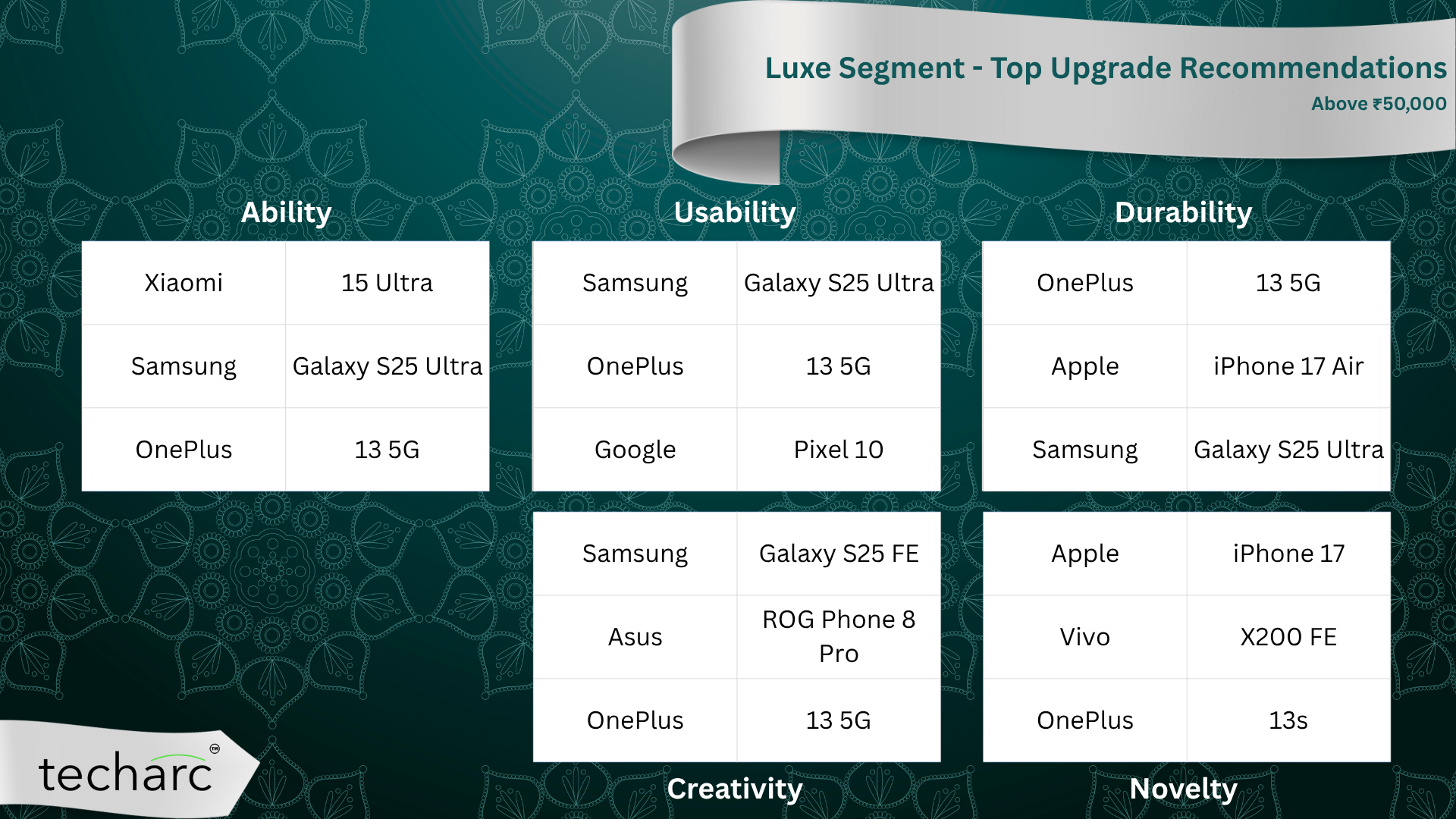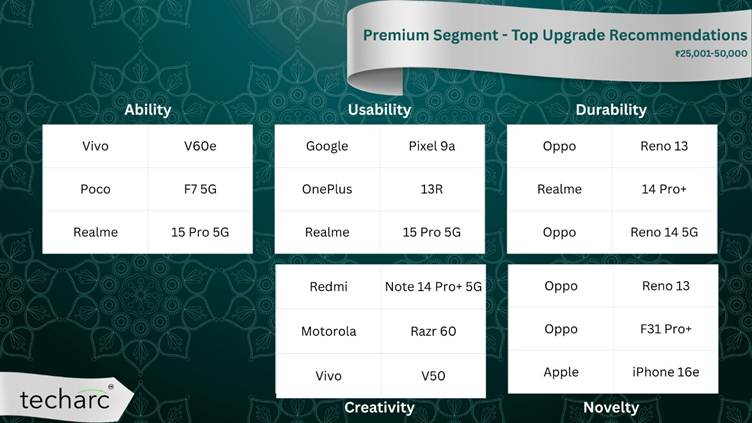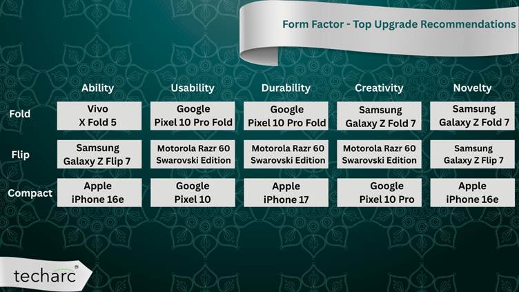 The upgrade reasons are categorised into 5 ‘tys’ by Techarc, which are ‘Ability’, ‘Usability’, ‘Durability’, ‘Creativity’, and ‘Novelty’. Techarc benchmarked all the models available for consumers in this festive season of 2025 and identified the smartphone models that offer the maximum value to consumers by the upgrade reason categories.