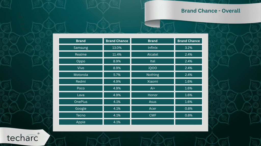 • Mid-Range Segment Brand Chance: Realme (15.5%) leads in brand chance within the mid-range segment, reflecting its strong presence and consumer reach. Oppo (11.1%) follows in second place, while Tecno and Vivo both stand at 8.9%, showcasing close competition for consumer choice in this range.