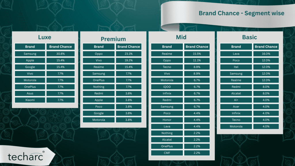 • Premium Segment Brand Chance: Oppo (23.1%) holds the highest brand chance in the premium segment, indicating stronger consumer preference and availability, followed by Vivo (19.2%) and Realme (15.4%), which also maintain notable consideration levels in this category.