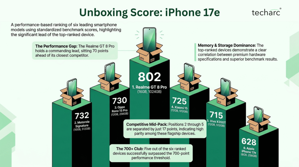 Despite its strategic strengths, the iPhone 17e could not perform well in our proprietary Unboxing Score, due to the aggressive hardware omissions, earning just 628 points and landing in last place among its five competitors. Within the ₹64,000–₹75,000 range, the realme GT 8 Pro leads with an impressive score of 802, followed by the Motorola Signature (732), the OPPO Reno 15 Pro (730), the Xiaomi 15 (725), and the vivo (715). This last-place finish is due to several factors, including its single-camera system, a lower-tier chipset, and a smaller battery.
